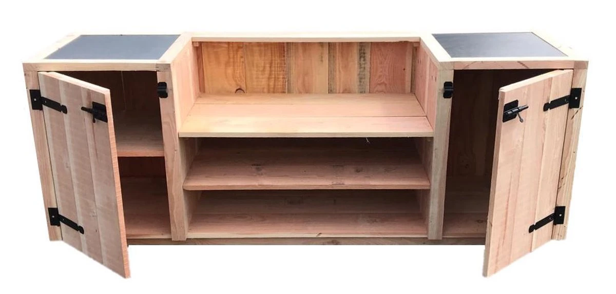 De maten zijn 220x60x90. Het vak in het midden is 108 cm. De kasten zijn 60×60 en op de kasten bevind zich een werkplank van betonplex (berkenhout).